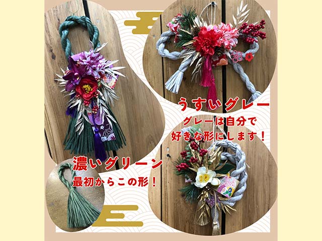 縄の長さ約1m 自分だけのオリジナルしめ縄をお作りいただけます!色は濃いグリーンと薄いグレーの2種類から選べます。※濃いグリーンは各回3個ずつと数が限られてます。