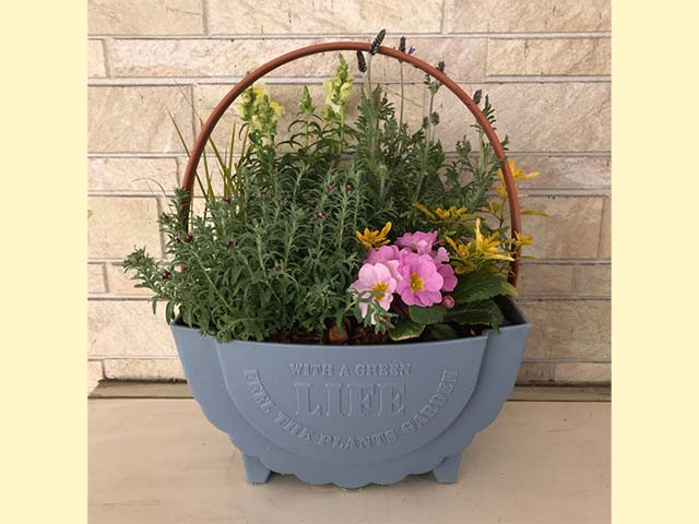 鉢の大きさ幅26×奥18×高さ36cm(持ち手込) 持ち手のついた鉢に季節の花を使って寄せ植えを作成します! ※花苗は写真と異なります。