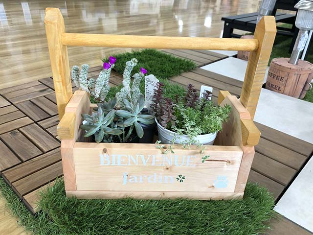 幅36×奥19×深14cm スコップなどお庭の道具を入れたり、寄せ植えしたりと使いやすい持ち手付ボックスにステンシルをします!